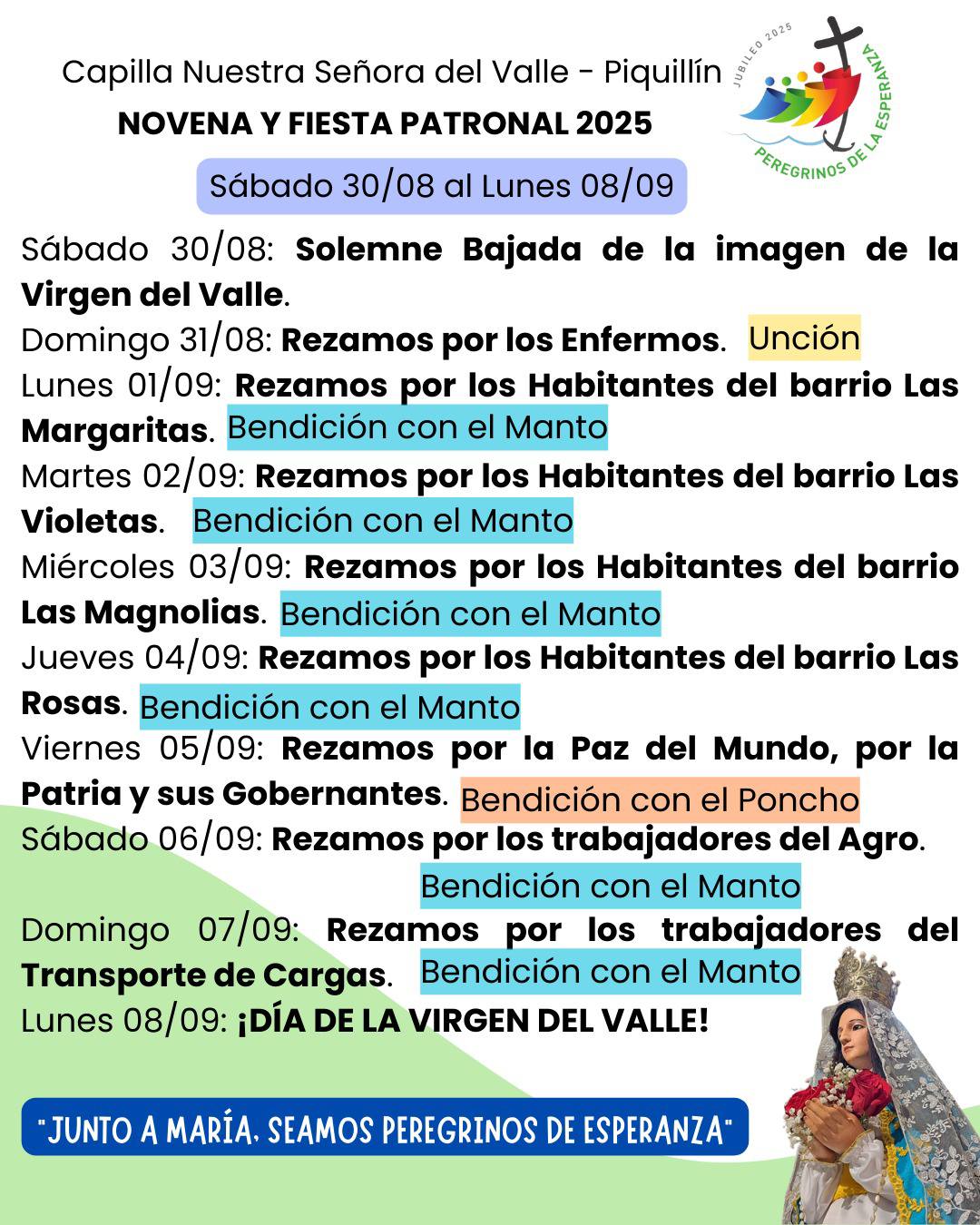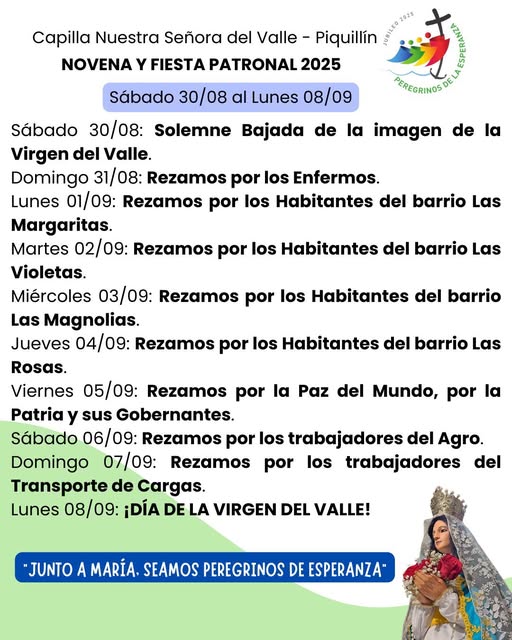 Las Fiestas Patronales en honor a Nuestra Señora del Valle, iniciaron el pasado sábado 30 de agosto y se extenderán hasta el lunes 8 de septiembre bajo el lema “Junto a María, seamos peregrinos de esperanza”.