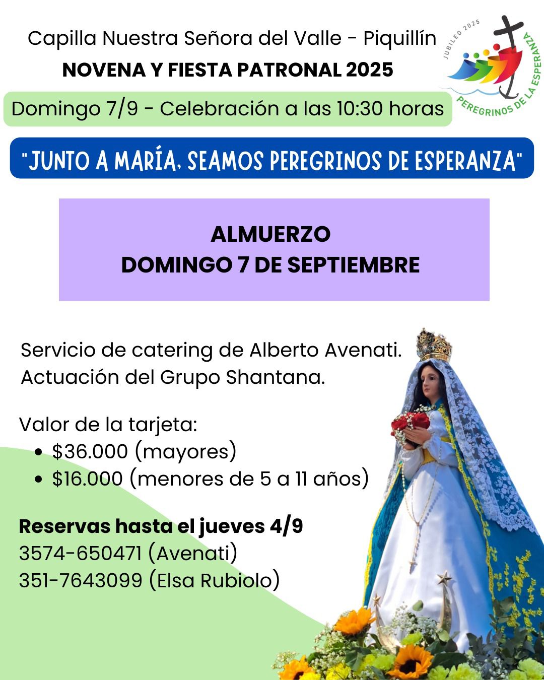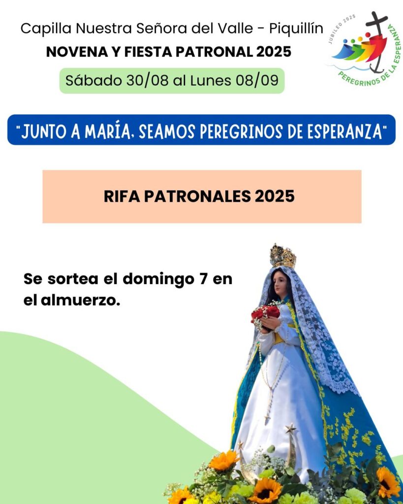 El domingo 7 de septiembre será una de las fechas centrales, con la misa patronal a las 10:30 horas, seguida de un almuerzo comunitario con servicio de catering de Alberto Avenati y la actuación del Grupo Shantana. Ese mismo día también se realizará el sorteo de la Rifa Patronal 2025.