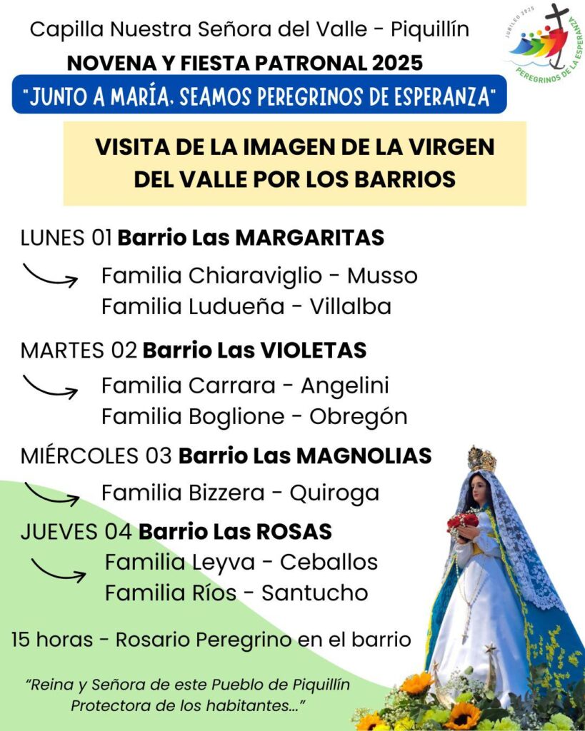 El programa incluye la tradicional novena, con celebraciones diarias, visitas de la imagen de la Virgen por distintos barrios, rezos comunitarios y bendiciones especiales. Cada jornada está dedicada a diferentes intenciones: desde los enfermos, los vecinos de los barrios Las Margaritas, Las Violetas, Las Magnolias y Las Rosas, hasta los trabajadores del agro y del transporte de cargas.